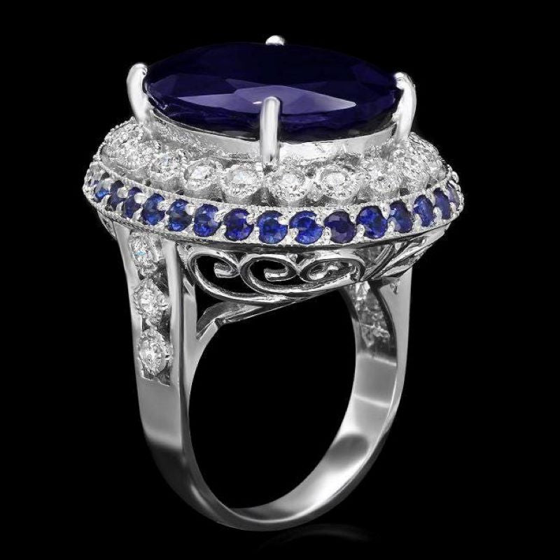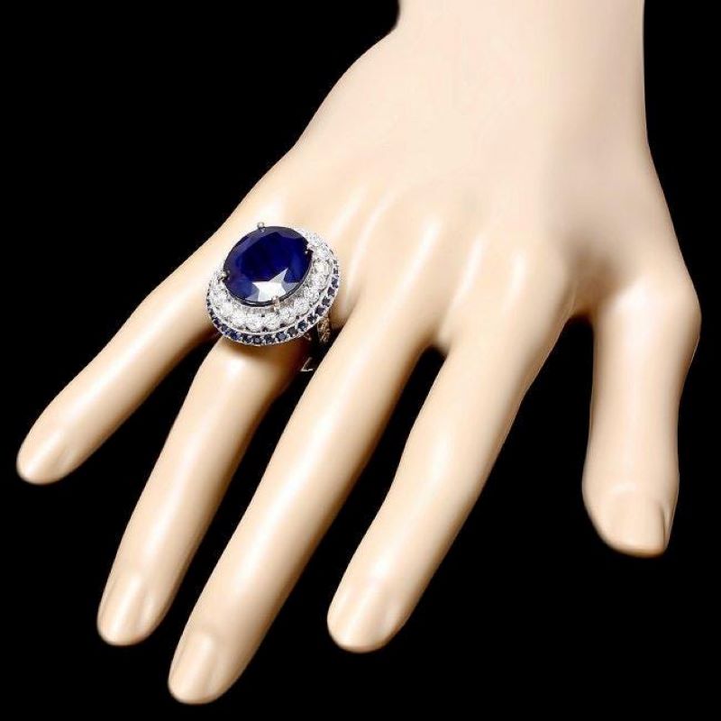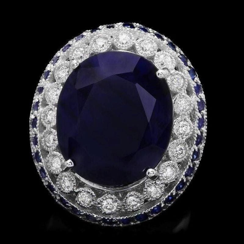 19.80 Carats Natural Sapphire and Diamond 14K Solid White Gold Ring Total Natural Sapphire Weights: Approx. 19.00 Carats Sapphire Measures: Approx. 17.00 x 15.00mm (1 Oval) Sapphire Measures: Approx. 2.00 mm (34 Round) Sapphire treatment: Diffusion Natural Round Diamonds Weight: Approx. 0.80 Carats (color G-H / Clarity SI1-SI2) Ring total weight: Approx. 12.8 grams SKU #PA64 |