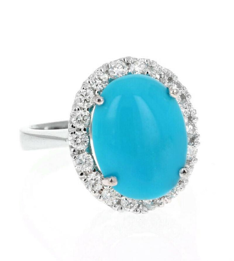 | 7.65 Carats Impressive Natural Turquoise and Diamond 14K White Gold Ring Suggested Replacement Value $5,600.00 Total Natural Oval Turquoise Weight is: Approx. 7.00 Carats Turquoise Measures: 12.00 x 10.00mm Natural Round Diamonds Weight: Approx. 0.65 Carats (color G-H / Clarity SI1-SI2) Ring total weight: 5.5 grams SKU #1243Â |